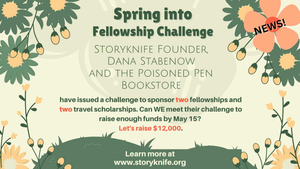 We’re going to give ourselves a little more time to do this – but we’re now aiming for $12,000 by May 15th! We need to raise about $9,500 in the next four weeks to succeed. Please help us. If you are a fan of Dana’s work, help support her dream – Storyknife, which provides the gift of time and space to write that Dana received so early in her career from Hedgebrook.