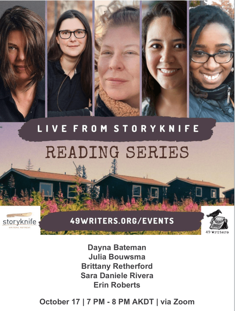 And speaking of gifts, Tuesday, October 17, at 7pm Alaska Time, you can listen to some of this month’s incredible writers in residence read from their work. Live from Storyknife, an event co-sponsored by 49 Writers, will be available via Zoom on this page. And if you miss it, or want to see any of the previous months’ amazing writers, check out the recorded events here.