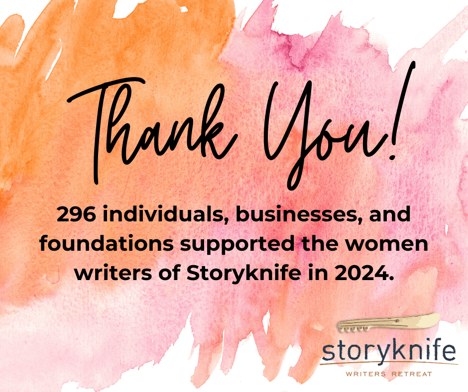 Let me take a moment to thank the 296 individuals, businesses, and foundations that supported the women writers of Storyknife last year. (Please take a moment to go to the oage and see who they are.) Without you, we couldn’t provide the space and the time that writers need to devote themselves wholeheartedly to their craft. Your generosity puts flowers by the bedsides, gorgeous food on the dinner table, heat in the cabins, and lights at the desks. More, it provides this magical place where women writers are told in every detail and every day, YOU are important and your story is important.