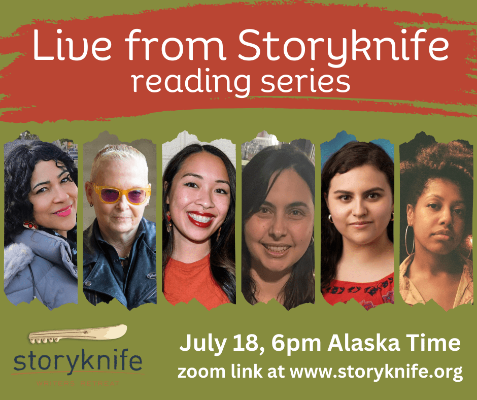 Join us on Thursday, July 18 at 6pm Alaska time for Live from Storyknife featuring July’s writers in residence. The session will be live on Zoom and the recording will be posted on this page after the reading.